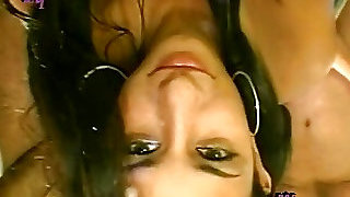 Two kinky dudes pissing on one lippy brown-haired chick in stockings